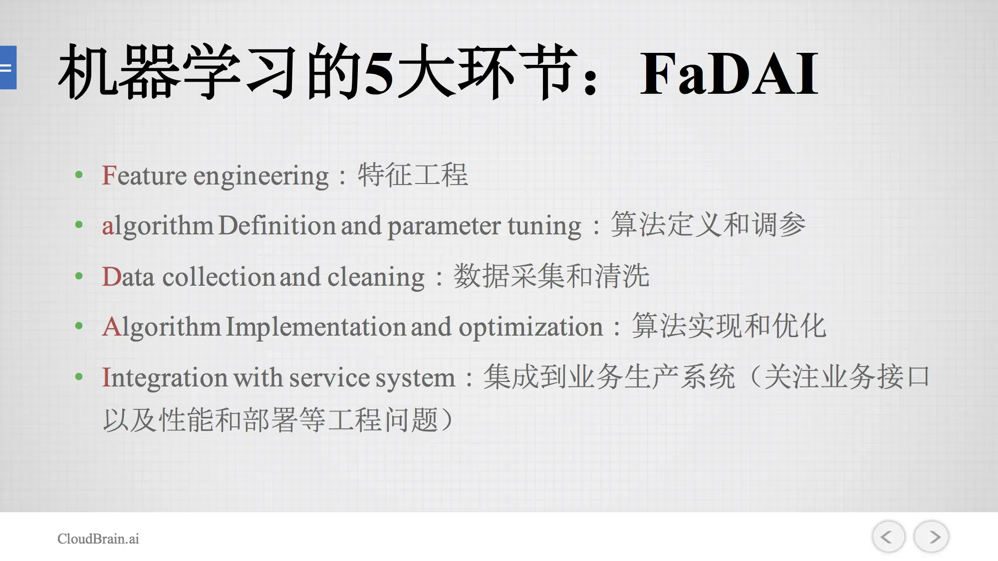 一是特征工程。第二是算法定义和调参,就是你该选择什么样的算法,用什么样的参数进行调节。第三是数据采集和清洗,接下来是实现这个算法并进行优化。‘I’代表和业务生产系统集成,所以我们就会简称为FaDAI这五大步骤。特征工程是这五大环节最重要的一部分。