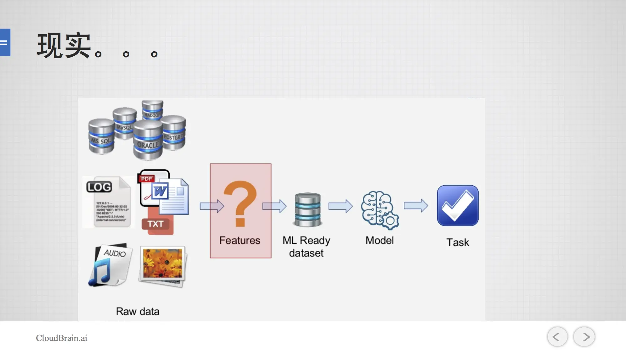 引用一下吴恩达的话:“应用机器学习其实就是在做特征工程,特征工程是非常难、耗时、也是需要专业知识的一个工作。”我们理想中机器学习的情况:有很干净的Raw data,然后变成可学习的Dataset, 通过某些算法学出某些模型,然后解决一个问题,这是最理想的一个状态。但现实中,我们会有各种各样的数据,有的从数据库来,有的从日志来,有的从半结构结构化文档来,有的从无结构的音频、图片中来。从中抽取什么特征,才能够被我们机器学习所使用,从而能学习出模型解决出问题呢?