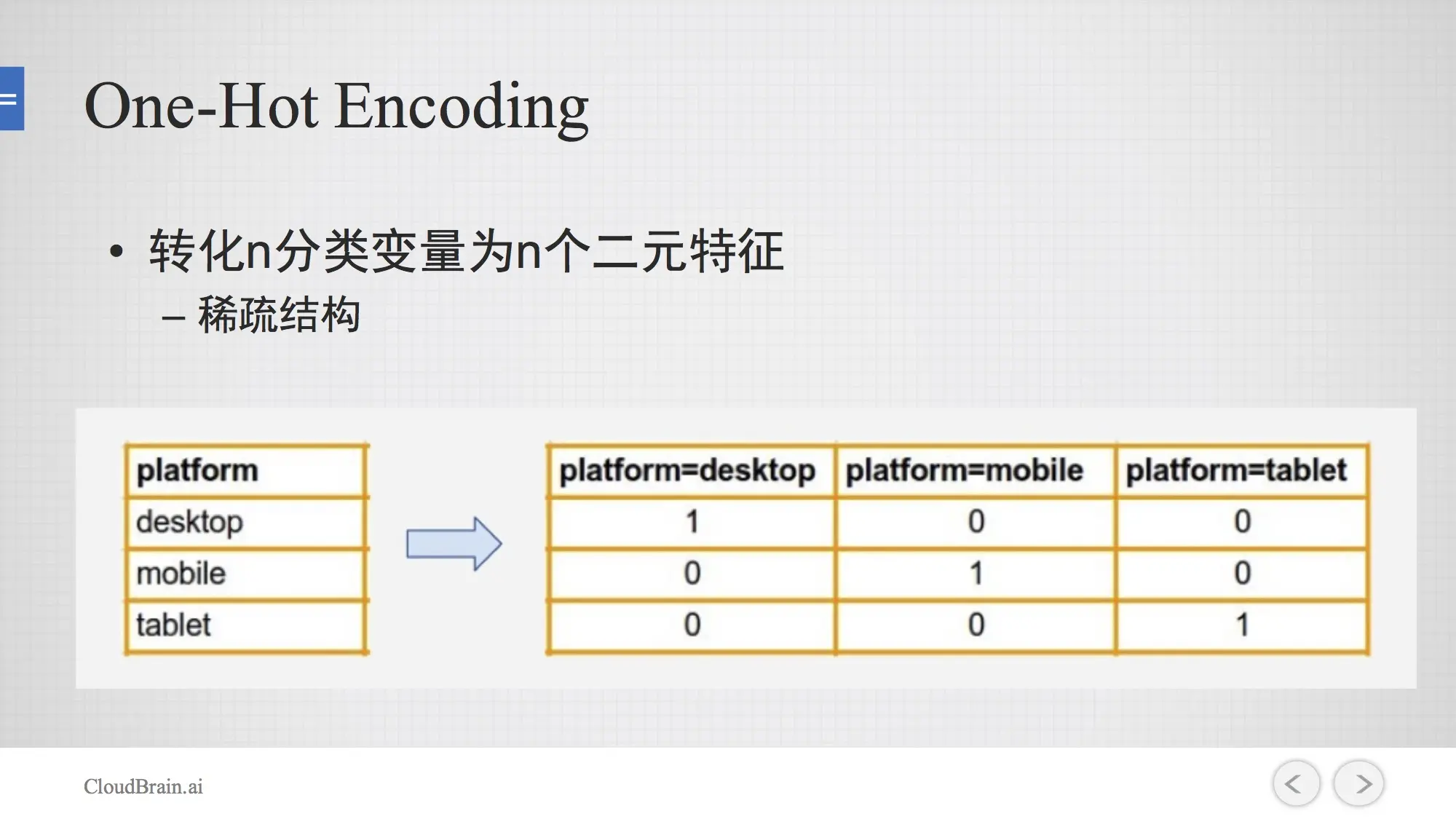 那最简单的一个特征工程,叫做One-Hot encoding。举例来说,platform这个维度有三个取值:desktop、mobile、tablet。 那我们可以转换成三个特征,如果平台是在desktop上,那这个特征就取1,如果在mobile上,那这个特征就取1,如果在tablet上,那这个特征就取1,这是一个非常稀疏的结构。举例来说,如果有十万个站点,那就十万维,这是十万维只有这一个维度上取1,其他都取0。