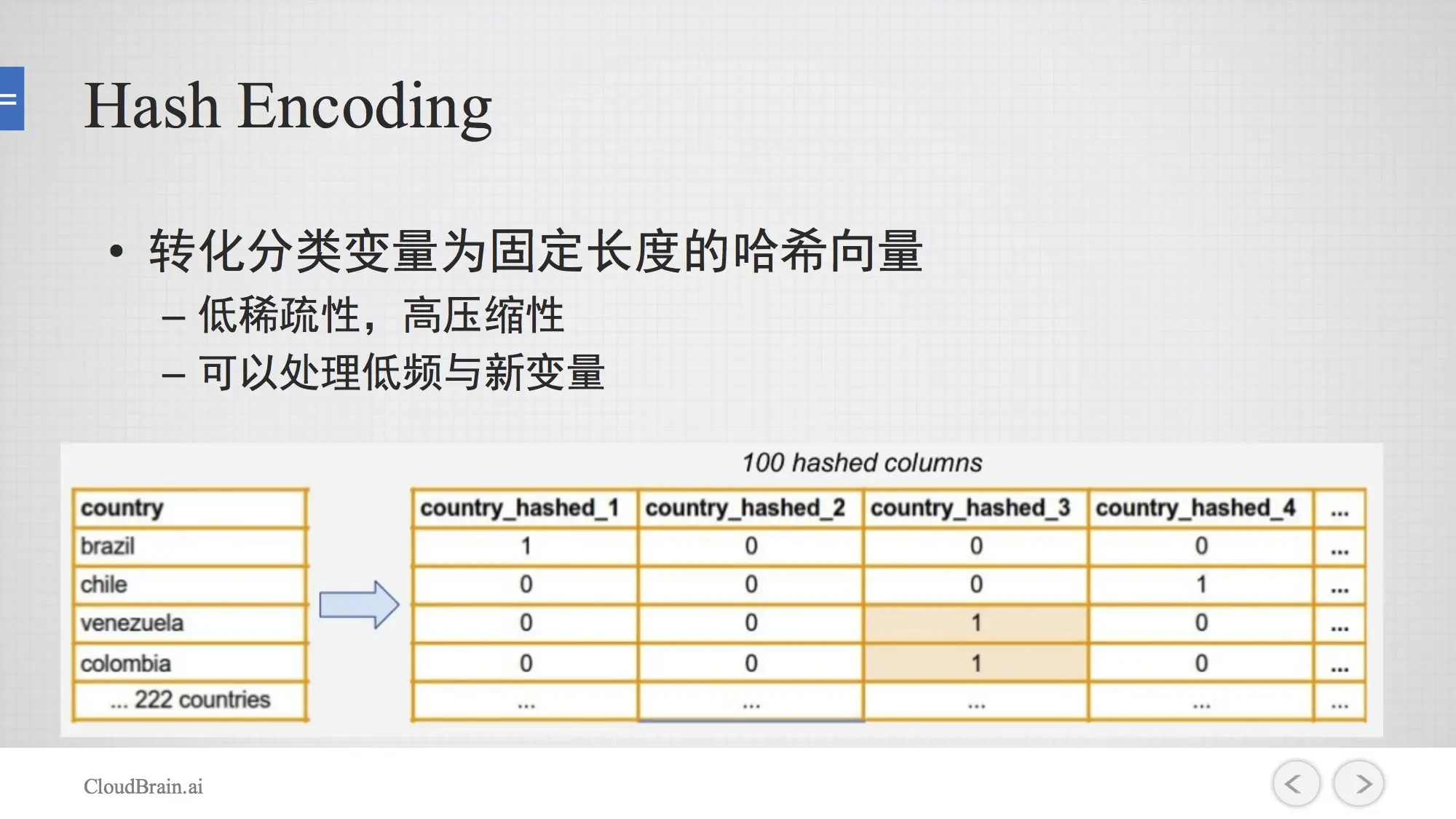 一种比较常见的方法就是做Hash Encoding。举例来说:有200多个国家,用Hash的方法把它转化为100多列,但用刚才One-Hot的方法就有200多列,但用Hash方式表达,参数是可调的,所以它可以缩成100、50,甚至10。那它会有一定的代价,比如说巴西和智利被放在一列,但是这两个国家可能有不同的特性,但他们必须share同样的位置。这是它们潜在的一个问题,但稀疏性是可以控制的,也可以处理低频和一些新的变量。这里隐含的条件是有一个假设,这个假设是有些特征可以share同一个位置。这个假设在深度学习中也会有使用。所以在实践中发现很多时候并不会影响实际的结果,只要你的参数空间相对是足够的,就是它有足够的表达能力。这个也是相对比较常见的一个方法 像有些比较知名、开源的机器学习的工具都有这样的一个功能。