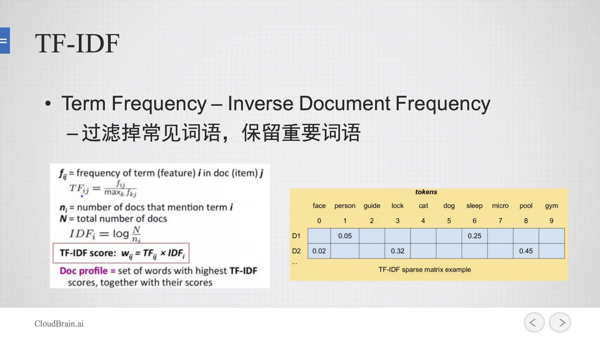 Bag of words是One-Hot encoding的一种表达,TF-IDF是对Bag of words的一种简单改进,它feature取值不仅仅取决于出现或不出现,它希望在这个feature的取值上能够反映这个单词对语义的相对重要性。Term Frequency 代表着一个词如果在文档中出现的次数越多,它可能的重要性越高。另外一方面,如果这个词在出现的文章个数越少,说明这个词更有区分性或者越具有代表性。 所以TF代表的是Term Frequency,IDF是words出现在document 的Frequency,两者相乘是信息检索领域对特征取值进行re-weighting的一种常见的方法。