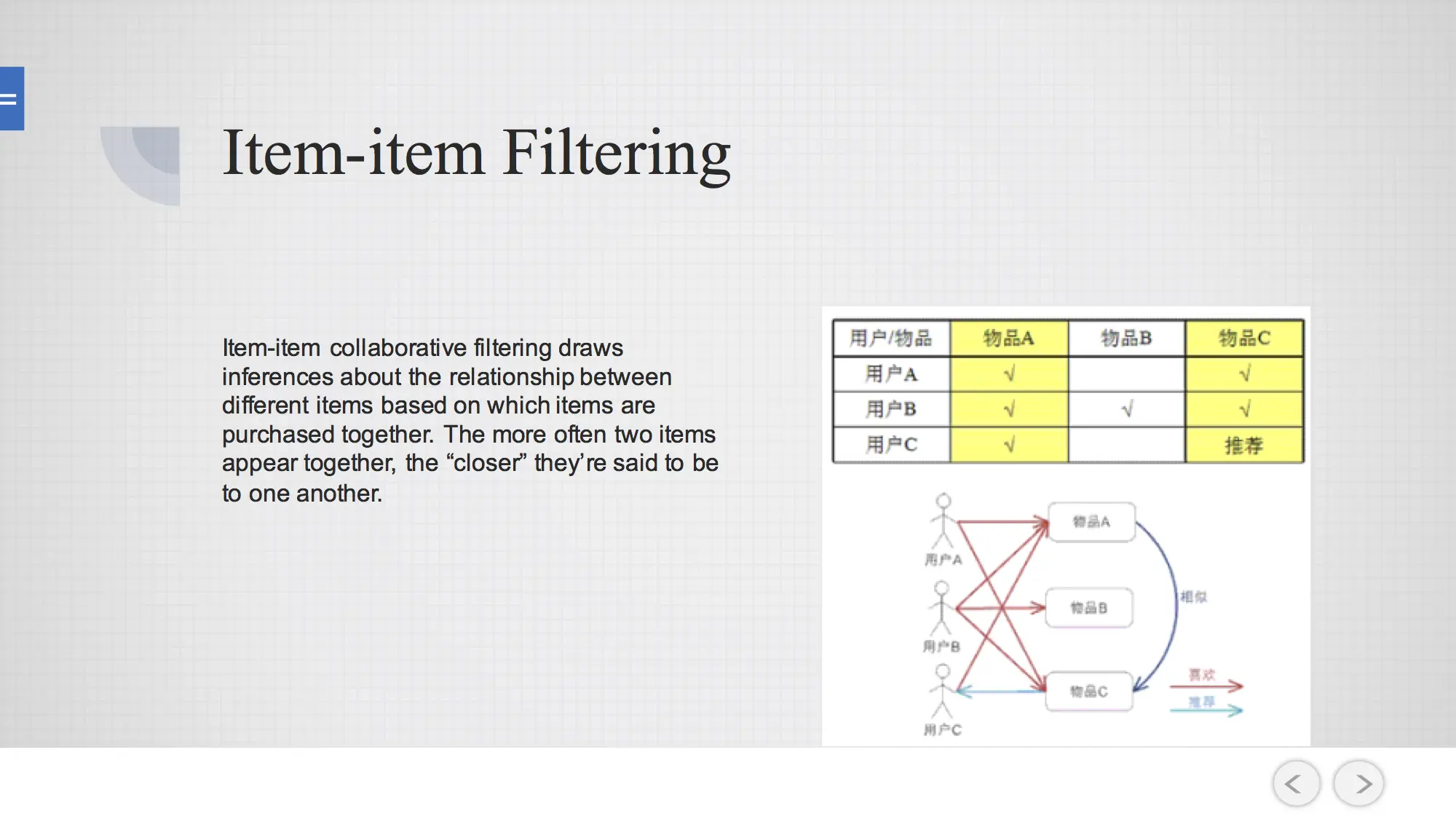 Item-item Filtering:现在有用户ABC和物品ABC, 我们考虑是否要把物品C推荐给用户C。我们看物品C和哪一个物品经常一起出现,发现是物品A。用户C被推荐了物品A,因此把物品C推荐给他。User-item Filtering 考虑对用户A进行推荐,先找到和A相似的可能是用户C,看用户C有说明额外的物品是用户A不知道的,物品D是用户A不知道的,那么D就会推荐给A。这两个可能是不同的维度,用哪种方法更好,也要看数据具体的特征来定。
