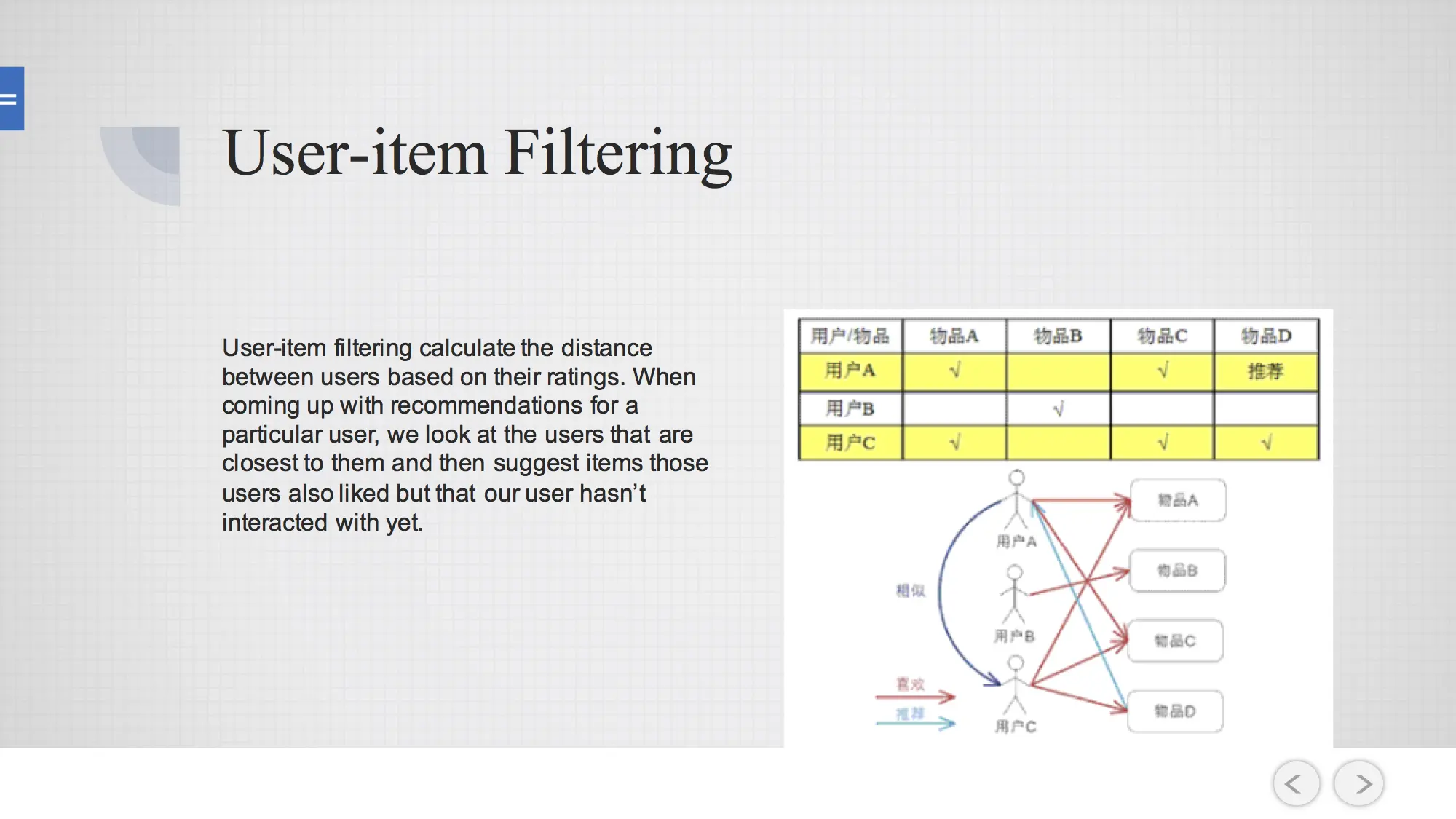 举例来说绿代表喜欢,红色代表不喜欢,我们要看一下该用户对电视机的喜好程度,什么样的用户和他会比较像?我们会注意到第二个和第三个用户,我们会借鉴第二、三个用户的喜好来猜测它在电视机上的喜好,也意味着它喜欢第三个物品。