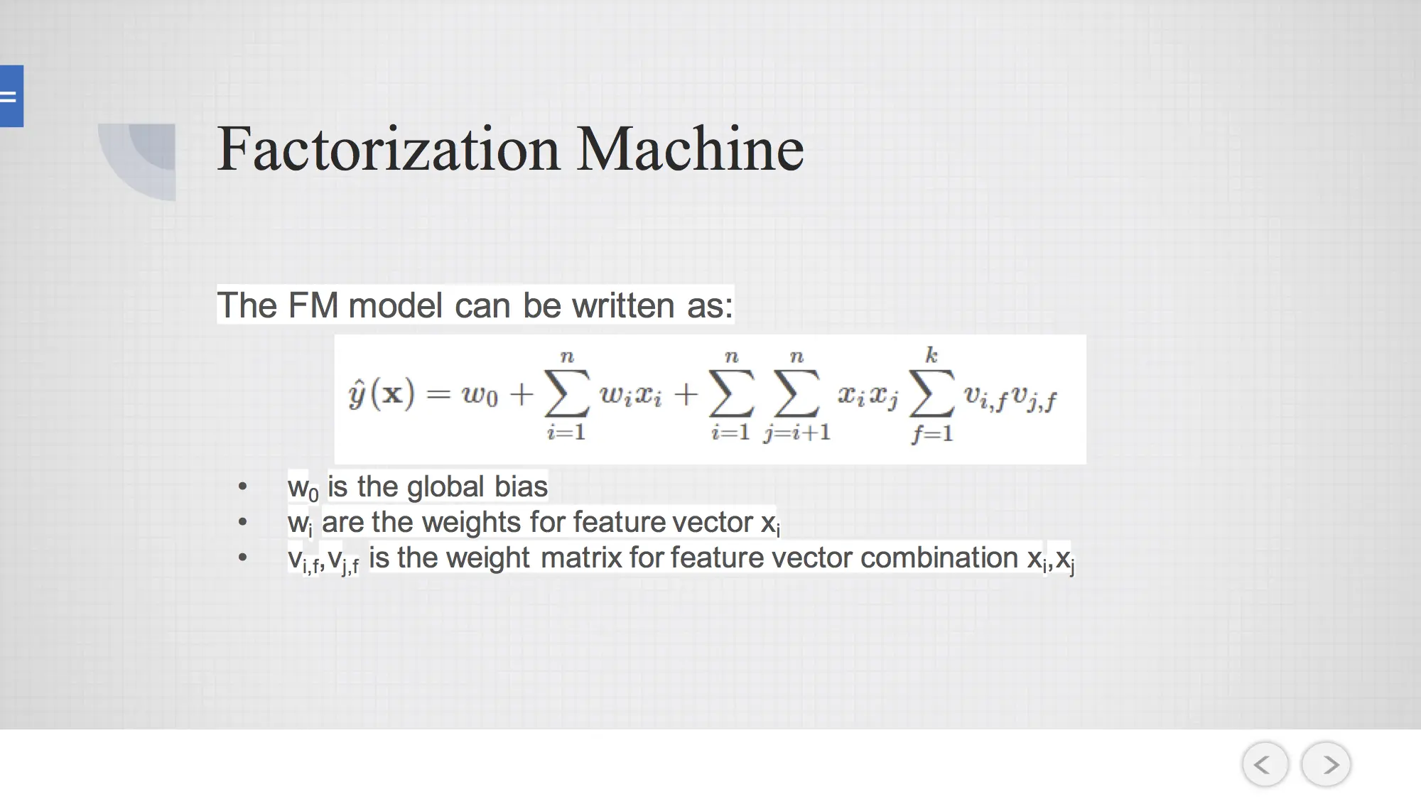 找 latent factor传统的技术是做矩阵因式分解,比如说我们有非常大的矩阵是nm的,我们通过找到两个nk和km的矩阵相乘可以重构出这样一个nm的矩阵,就是SVD或者LSI,可能有不同的名词但是有相同的做法。所以这个想法就被延展到了FFM上面,这里最关键的想法是把wij定义成vi 乘以vj的内积,vi是k维上的一个元素,这样的一个好处是把O(n^2)的复杂度降到O(n)的复杂度。所以wij就不是任意的一个参数,它是受限制的一个参数。所以FM可以被表达成下面这样一个式子,它不在是O(n^2)的复杂度,而是O(nk)这样一个问题,k是一个可选的参数,不会随着数据量或特征的增长而变化。计算量看起来更大了,但实际上有很多计算是重复的,通过简单的变化可以变成O(nk)的复杂度。