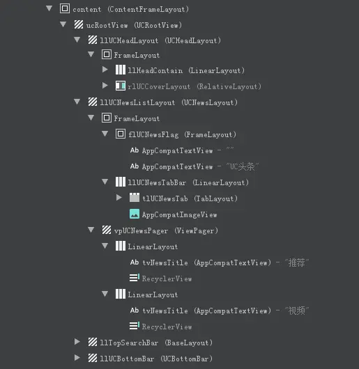 整个主界面被一个UCRootView包裹,它继承自RelativeLayout,里面实现自己的事件传递逻辑,并定义滑动接口。rootview下有四个大的子view组件,分别是Head,NewsPager,Searchbar和Bottombar,这些都继承自BaseLayout(自定义的viewgroup),到目前为止我们的UC浏览器布局结构如下(如果看的眼花,别打我哈):