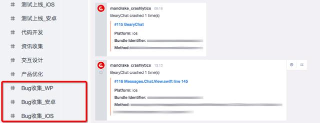 1.通常,一个版本上线后,我们会用 Crashlytics 来收集移动端的崩溃日志,或使用 Bugly、BugHD、听云等服务来收集崩溃和 Bug 信息。在倍洽中直接启用这些工具和服务对应的机器人,不仅能够在无需来回切换工具界面的情况下实时查收消息,客观上还在倍洽中汇总备份了信息,使其更具有可回溯性,便于我们以后根据日期来回顾当时所出现的问题,更好地进行版本质量管理。