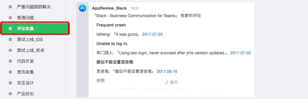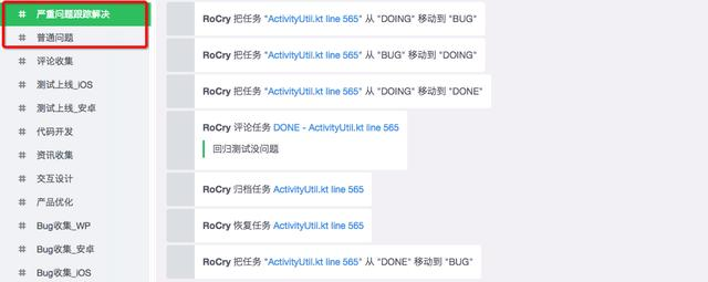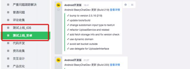 倍洽移动开发组通常会根据实际的使用场景在自己的倍洽团队上创建不同的讨论组,实现信息的按主题分流和收集。例如,创建相关「Bug 收集」组用来收集各移动端日常产生的报错信息、「问题跟踪」组用来追踪管理各种问题的处理进展、「资讯收集」组用来订阅最新的技术动态、「代码开发」和「交互设计」用组来跟进产品开发动态、「测试上线」组用来发布产品测试信息和收集测试反馈、「评论收集」组用来监控自己产品和竞品在各个应用商店中的舆情、「产品优化」组则用来汇总查看一些用户的反馈建议等等。