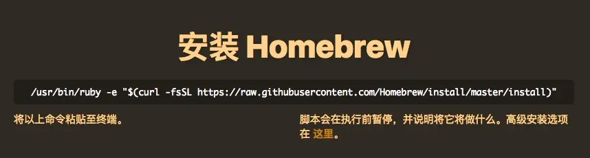 进入Homebrew官网 https://brew.sh/index_zh-cn.html, 复制这里的命令到终端安装即可(安装命令可能会变, 所以请自行前往复制)