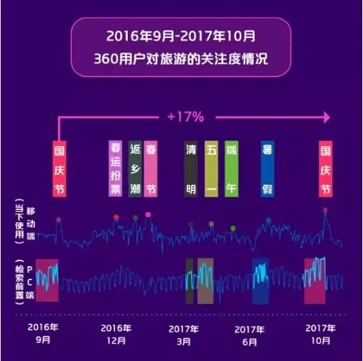 从《360MASTER2017年度榜单-旅游行业洞察》中我们可以很清晰地发现,相对于移动端与节假日高度重合的活跃度高峰,PC端的活跃时间明显前置。人们通常习惯于出行前使用PC搜攻略、查机酒,为出行决策做参考;在出行中使用手机查交通、搜周边,进行景区内的二次消费决策。这也给旅游营销提了个醒,PC和移动要两手抓,两手都要硬,在PC端注重线路信息、旅行攻略、机酒折扣等内容吸引兴趣;在移动端注重LBS周边推荐,用个性化推送赢得二次消费的机会。