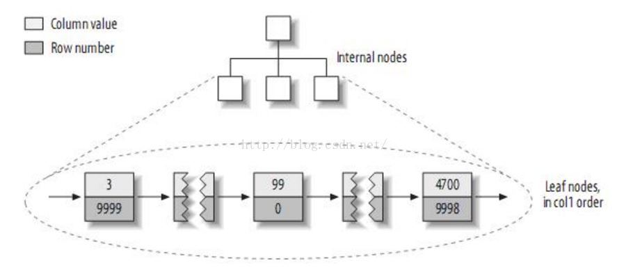 也就是它们使用主键的值作为聚集数据,然后每个叶子包含了每行的全部记录。聚簇索引的二级索引是下面的样子: