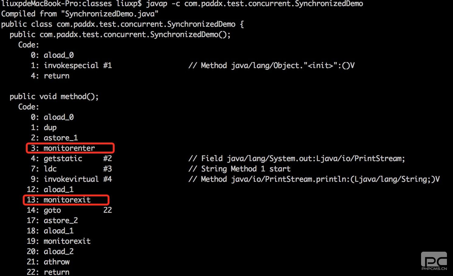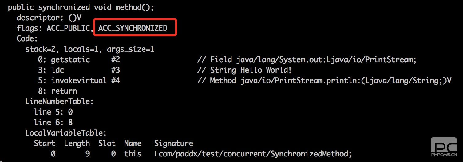 从反编译的结果来看,方法的同步并没有通过指令monitorenter和monitorexit来完成(理论上其实也可以通过这两条指令来实现),不过相对于普通方法,其常量池中多了ACC_SYNCHRONIZED标示符。JVM就是根据该标示符来实现方法的同步的:当方法调用时,调用指令将会检查方法的 ACC_SYNCHRONIZED 访问标志是否被设置,如果设置了,执行线程将先获取monitor,获取成功之后才能执行方法体,方法执行完后再释放monitor。在方法执行期间,其他任何线程都无法再获得同一个monitor对象。 其实本质上没有区别,只是方法的同步是一种隐式的方式来实现,无需通过字节码来完成。