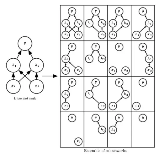 和一般的Bagging模型不同,上述的所有网络只是网络结构不同,但所有的参数都是共享的。因此,这种方法的效果比直接训练同样数量的独立网络要差一些。但是,我们应该注意到,当有n个特征时,不同结构的数量可以达到2n个!对于如此巨大的网络数量,训练独立网络本身就是一件不可能的事情。所以,结构不同、参数共享的网络已经是一种非常好的实现方法了。另外,指数级别的网络数量也保证了共享参数的网络能达到好的预测效果。