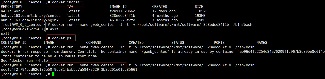 需要说明的是,不一定要使用“镜像 ID”,也可以使用“仓库名:标签名”,例如:docker.cn/docker/centos:centos6。
