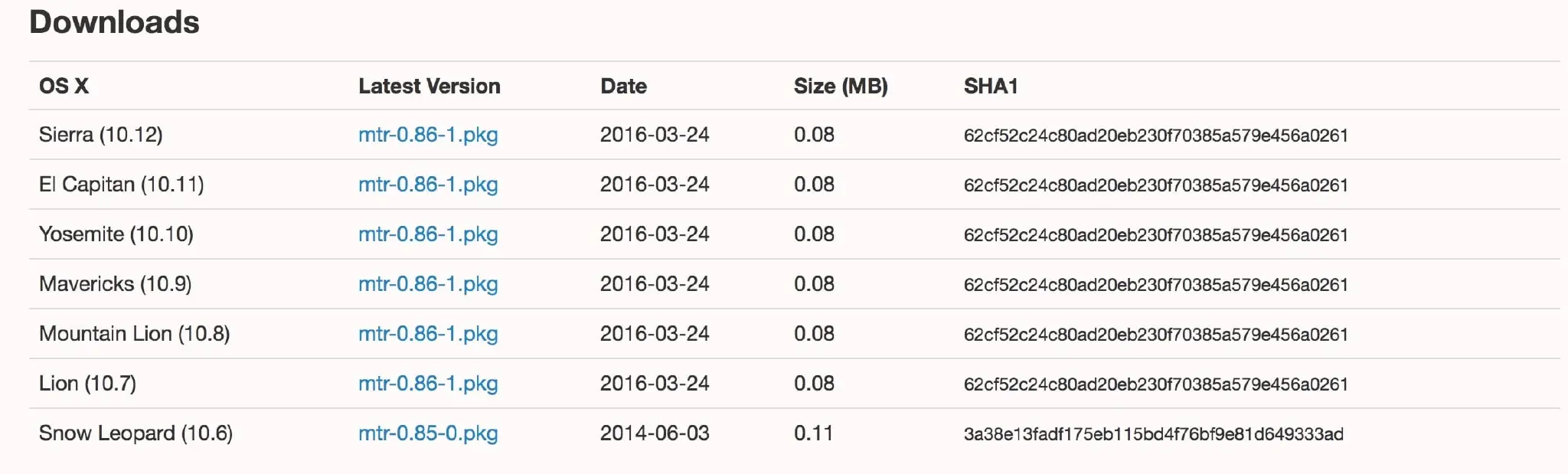 一种方式: 下载地址:rudix.org/packages/mt… 根据自己系统版本下载对应的 MTR 版本安装即可。