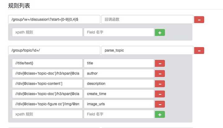 如上面 /group/\w+/discussion\?start=[0-9]{0,4}$ 这个对应的是小组分页的链接正则,遇到这些链接,只要丢到队列中,由 scrapy 下次处理,/group/topic/\d+/ 这个对应的是话题的详情链接,遇到这些,则执行 parse_topic 函数,那么这个函数具体执行什么内容,这就看下面配置的 xpath 规则,xpath 教程 ,如我们需要 title, author, description, create_time, image_urls 这几个字段,直接配置即可,只要能通过 xpath 语法找到。