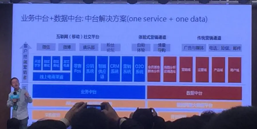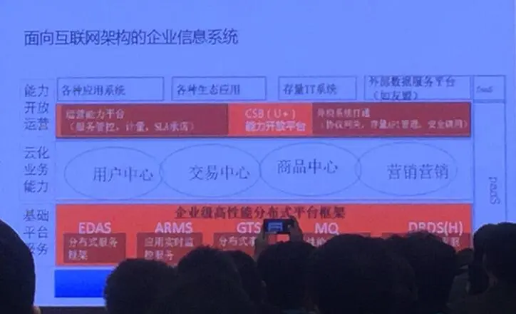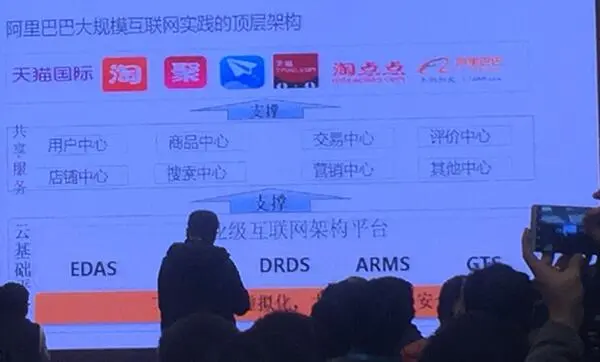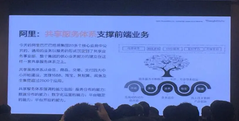赵勇 阿里云架构师 赵老师主要给我们介绍了阿里的中台架构,主要意思是将原来的淘宝、天猫、1688等烟囱式架构,改造为中台服务,具体功能开发时,调用底层中台接口即可。