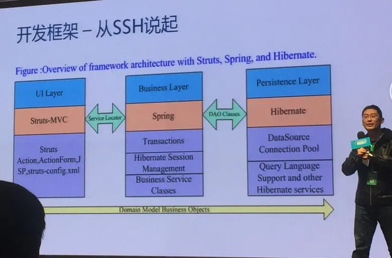 张亮 当当网首席架构师 曹祖鹏 千米网首席架构师 为什么会两位老师,说来很搞笑,曹老师跟我们说这也是他的一种尝试,前一天他看了一晚上郭德纲视频,就是为了第二天能给我们带来不一样的感觉。