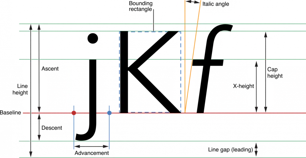 由上图可知,一个字符最高点到基线的偏移叫做 Ascent,最低点到基线的偏移叫做 Descent,单行的行高 Line Height 由 Ascent、Descent 与 Line Gap 相加得出。