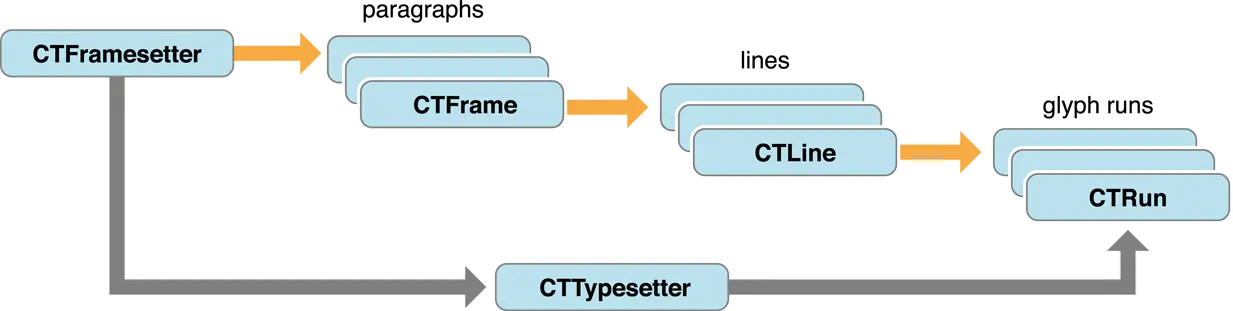 - 通过 CTFramesetter 和 CGPath 创建 CTFrame,然后可将其绘制在当前的 context 上;
