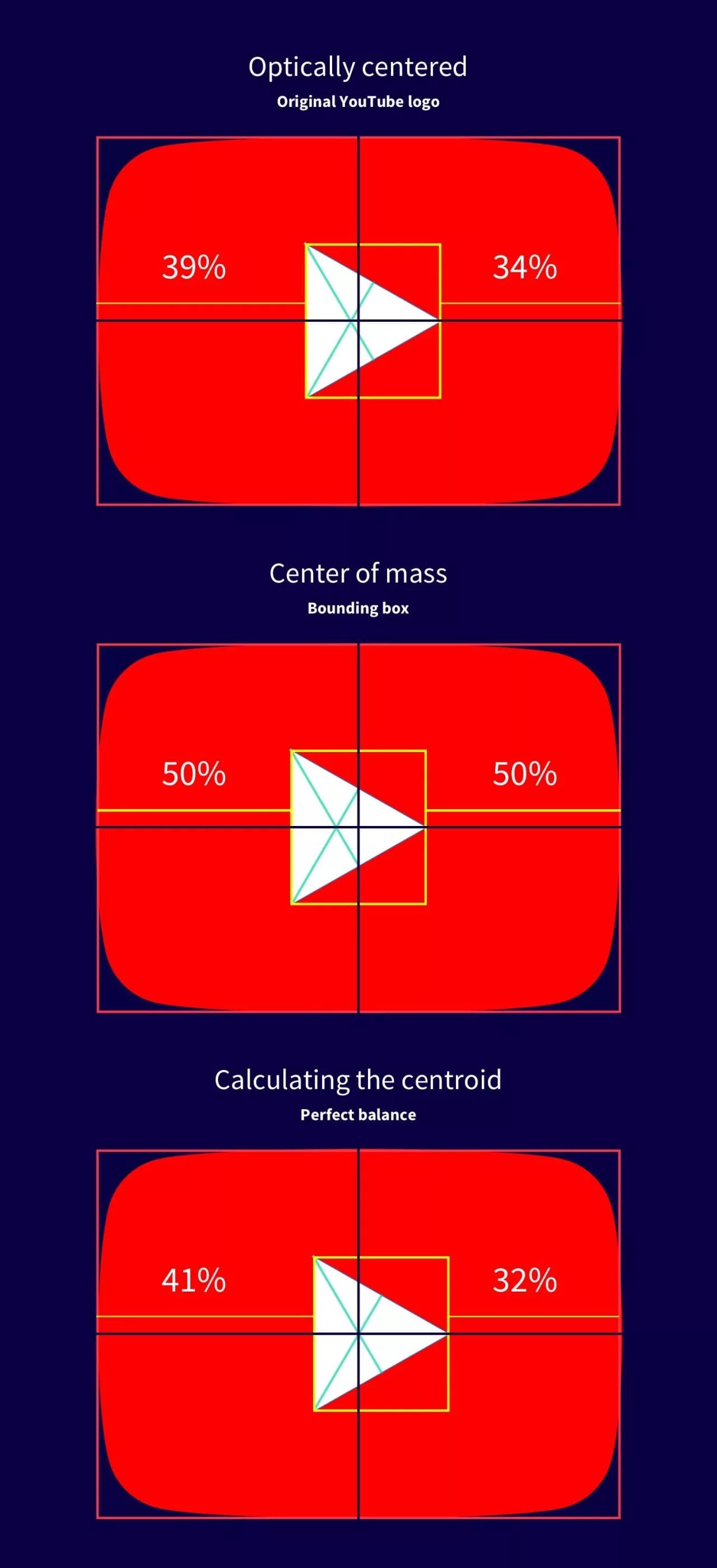 将一个三角形置于 圆角/直角 矩形边框中,可能会使它看起来居中位置不对。造成这个现象的原因被称为「三角形分割错觉」。三角形质心是基于最小外接矩形的。所以,如果你打算把一个点放到等边三角形高度一半的位置,你会发现它看起来要超过一半。