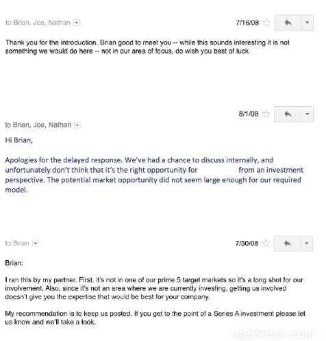当下一次你提出创意却被拒绝的时候,我希望你想想这些邮件。——Brian Chesky![]()