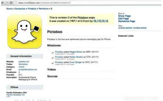 由Evan Spiegel和他的朋友Bobby Murphy和Frank Brown创建的Snapchat,它的第一版Picaboo并不成功,只吸引了大约100个用户。历经了30余次失败,它才被改进成叫做Snapchat的完美产品。Picaboo率先推出了图片阅后即焚功能。但据Evan Spiegel说,“唯一真正使用Picaboo的人可能是我妈妈”。