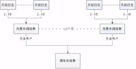 将一年的对局日志全部读入内存?考虑到王者的体量,打消了这个想法。分治法也许是突破口:先把每个月的对局日志合并计算,然后对12个月的中间结果再做一次合并。图示如下,每天的日志评估量级是2.5E,月活用户评估量级是1.2E,这个规模可以轻松应对。