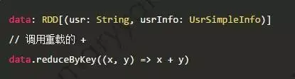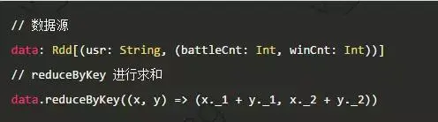从一个简单例子来,求玩家的对局数和胜场数。数据源加上了字段含义,实际的代码会更简洁 data: Rdd[(String, (Int, Int))]。