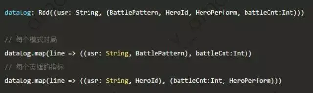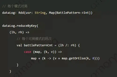 两个 map算子 都会对全量对局日志进行 transform,内存开销极大。Key-Value结构的RDD,修改Value是正常的,但是应该避免改变 Key。突破点在于:对局模式和英雄数枚举下来是比较少的,适合HashMap存储;最后reduceByKey 阶段做 Foldleft 合并数据。示例如下。