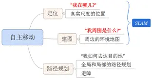 如下图,通俗的来讲,SLAM回答两个问题:“我在哪儿?”“我周围是什么?”,就如同人到了一个陌生环境中一样,SLAM试图要解决的就是恢复出观察者自身和周围环境的相对空间关系,“我在哪儿”对应的就是定位问题,而“我周围是什么”对应的就是建图问题,给出周围环境的一个描述。回答了这两个问题,其实就完成了对自身和周边环境的空间认知。有了这个基础,就可以进行路径规划去达要去的目的地,在此过程中还需要及时的检测躲避遇到的障碍物,保证运行安全。