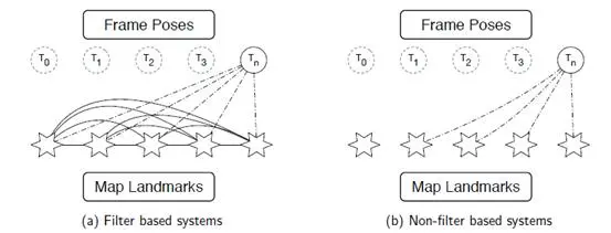 采用滤波器的SLAM,如下图(a),估计n时刻的相机位姿Tn需要使用地图中所有路标的信息,而且每帧都需要更新这些路标的状态,随着新的路标的不断加入,状态矩阵的规模增长迅速,导致计算和求解耗时越来越严重,因此不适宜长时间大场景的操作;而采用优化算法的SLAM,如下图(b),通常结合关键帧使用,估计n时刻的相机位姿Tn可以使用整个地图的一个子集,不需要在每幅图像都更新地图数据,因此现代比较成功的实时SLAM系统大都采取优化的方法。