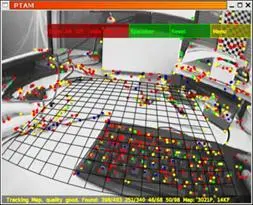 2011年,Newcombe 等人提出了单目DTAM 系统[11], 其最显著的特点是能实时恢复场景三维模型(如下图)。基于三维模型,DTAM 既能允许AR应用中的虚拟物体与场景发生物理碰撞,又能保证在特征缺失、图像模糊等情况下稳定地直接跟踪。DTAM采用逆深度(Inverse Depth)[12]方式表达深度。如下图,DTAM将解空间离散为M×N×S 的三维网格,其中M× N为图像分辨率,S为逆深度分辨率,采用直接法构造能量函数进行优化求解。DTAM 对特征缺失、图像模糊有很好的鲁棒性,但由于DTAM 为每个像素都恢复稠密的深度图, 并且采用全局优化,因此计算量很大,即使采用GPU 加速, 模型的扩展效率仍然较低。