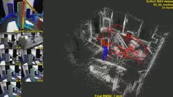 2016年,LSD-SLAM的作者,TUM机器视觉组的Engel等人又提出了DSO系统[26]。该系统是一种新的基于直接法和稀疏法的视觉里程计,它将最小化光度误差模型和模型参数联合优化方法相结合。为了满足实时性,不对图像进行光滑处理,而是对整个图像均匀采样。DSO不进行关键点检测和特征描述子计算,而是在整个图像内采样具有强度梯度的像素点,包括白色墙壁上的边缘和强度平滑变化的像素点。而且,DSO提出了完整的光度标定方法,考虑了曝光时间,透镜晕影和非线性响应函数的影响。该系统在TUM monoVO、EuRoC MAV和ICL-NUIM三个数据集上进行了测试,达到了很高的跟踪精度和鲁棒性。