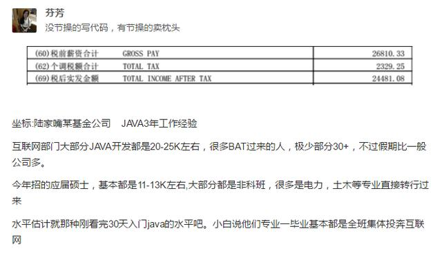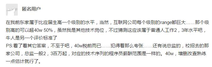 1.40W如果是166薪的话也就是2.5X16=40,所以看起来很多,其实对于一个程序员来说,并不是特别的难以想象,只要扎扎实实学习努力,有个几年也就达到了! 2.程序员工作空闲之余也就是逛逛论坛,上上网,聊聊天。下班时间宅在家里,打打游戏,写写代码,写写博客,很少锻炼身体,以至于某天的头条就有可能是某某公司大老猝死了(就在今天极客头条上报到腾讯一个游戏主管猝死了),所以大伙们懂的。 3.话题到这里就结束了,java学习的可以来我的群642830685,群里每天都有对应资料学习 ,欢迎初学和进阶中的小伙伴。