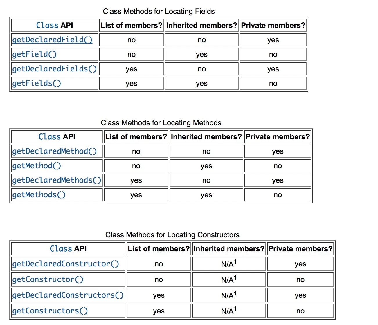 在oracle的教程中,整理了三个表格,介绍了如何获取类的成员信息。