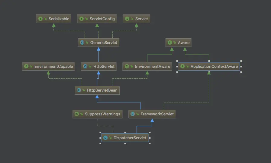 可以看到蓝色的继承关系到 Servlet 相信大家在学习MVC框架之前对 HttpServlet