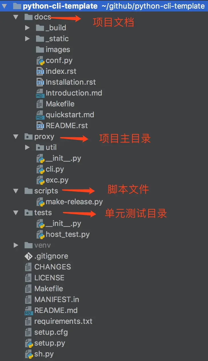 如上图,这就是一个比较规范的Python CLI应用项目了,下面一一讲下各文件的用途:
