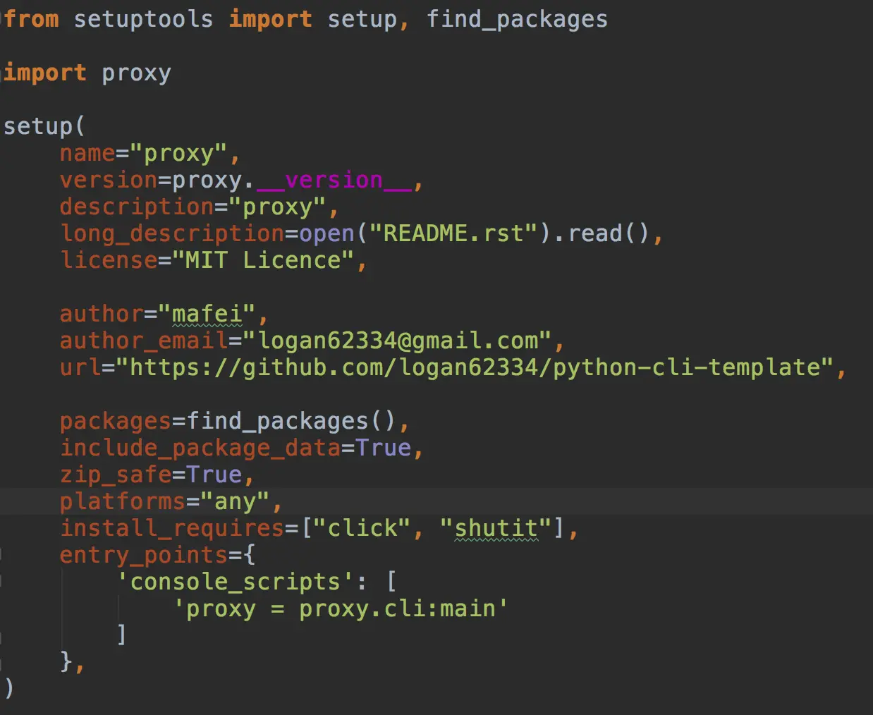 最重要的就是setup.py这个文件了,项目最后打包发布到pypi仓库主要的配置信息都在这里了,如下图: