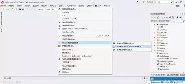 通过VS IDE 提供的NuGet(包管理器控制台)进行NHibernate的安装。如下图: