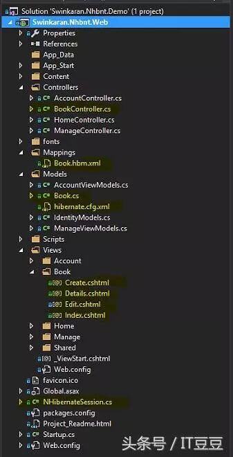 我们开始在Visual studio中创建一个项目。使用MVC模板添加一个名为Swinkaran.Nhbnt.Web的ASP.Net Web应用程序项目。在这里,将添加新的库和文件。以下屏幕截图显示将被添加到项目中的文件,在本教程的后面我们将讨论这些文件中的每一个。