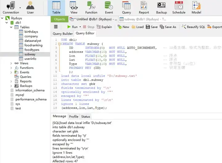 into table db1.subway -- 导入本地文件语句