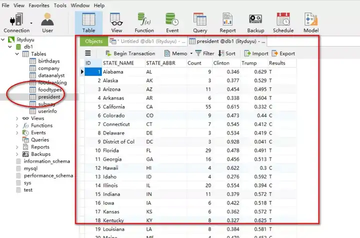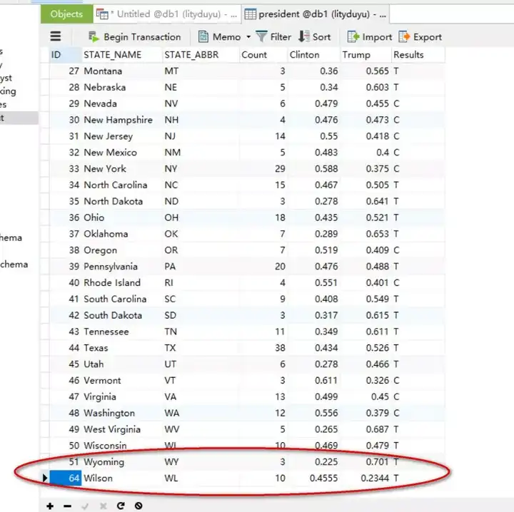 INSERT INTO db1.president (STATE_NAME,STATE_ABBR,`Count`,Clinton,Trump,Results)