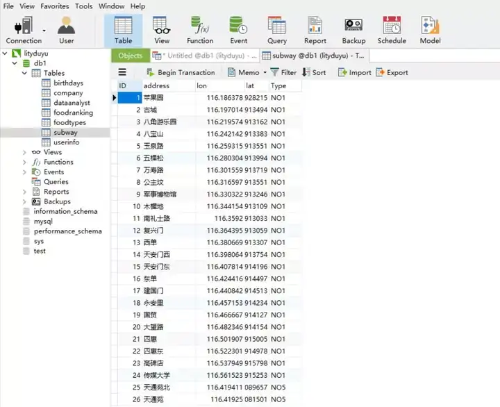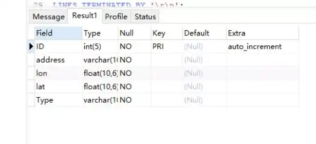 (address,lon,lat,Type); -- 最后一行指定要导入的列名(次内列名需与之前新建的空表列名严格匹配)