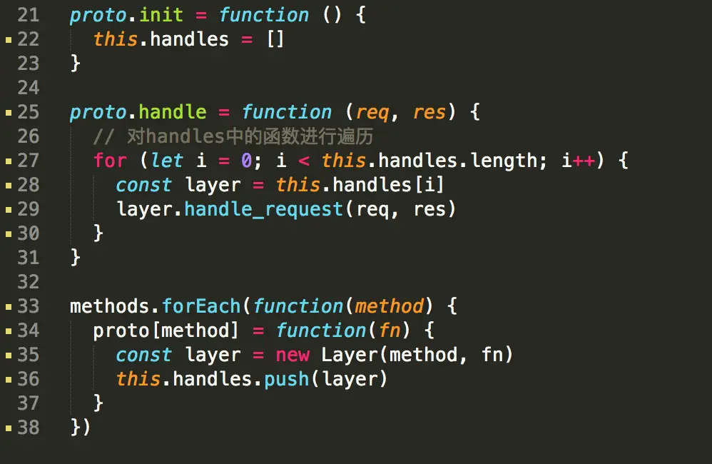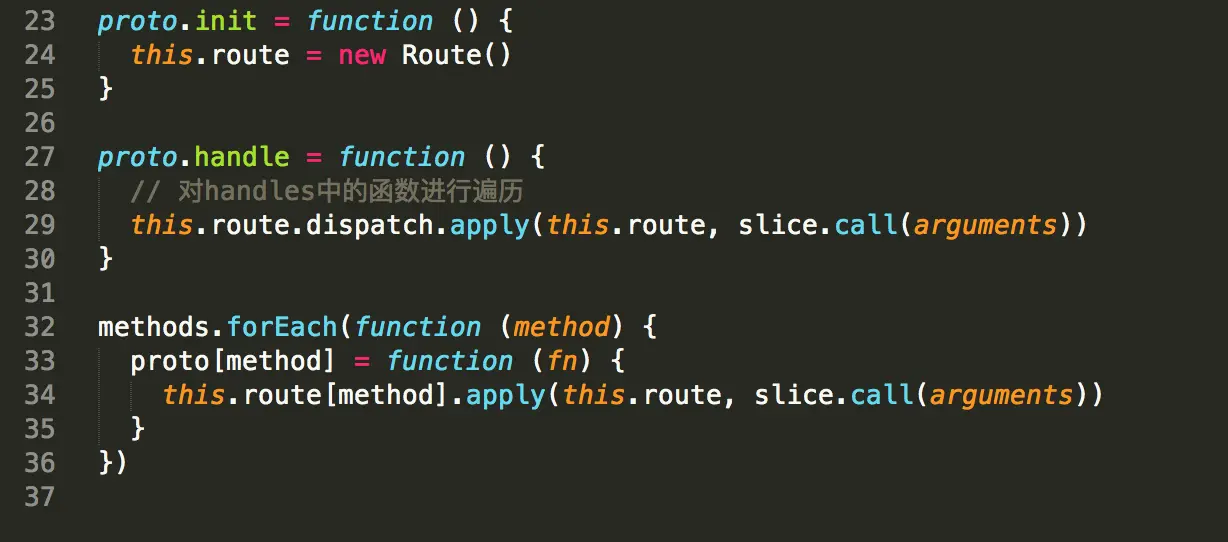 在Route的构造函数里,Route保存了一个stack,保存了一个methods数组。当我们调用app.get(fn1, fn2)时,实际上调用的是route.get(fn1, fn2)。这部分实现在34-43行。对每一个handler,我们的做法是创建一个layer,然后push到route.stack中。