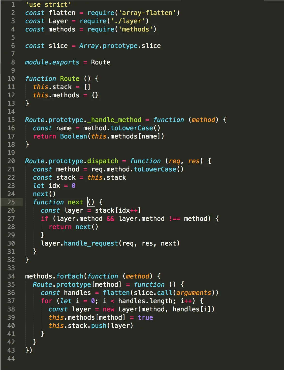 也就是说express.js里并没有接触Layer,而是初始化了一个Route,当请求到达是,调用route.dispatch进行处理。同样app.get等这些函数,也是调用Route对应的get函数。所以关键就是Route.js。先看下他的代码