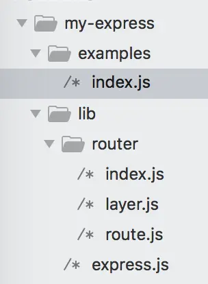 从图中我们可以看出,我们把layer,route都放到了lib/route文件夹里,里面的index.js就是我们刚才说的新增的lib/route/index.js文件