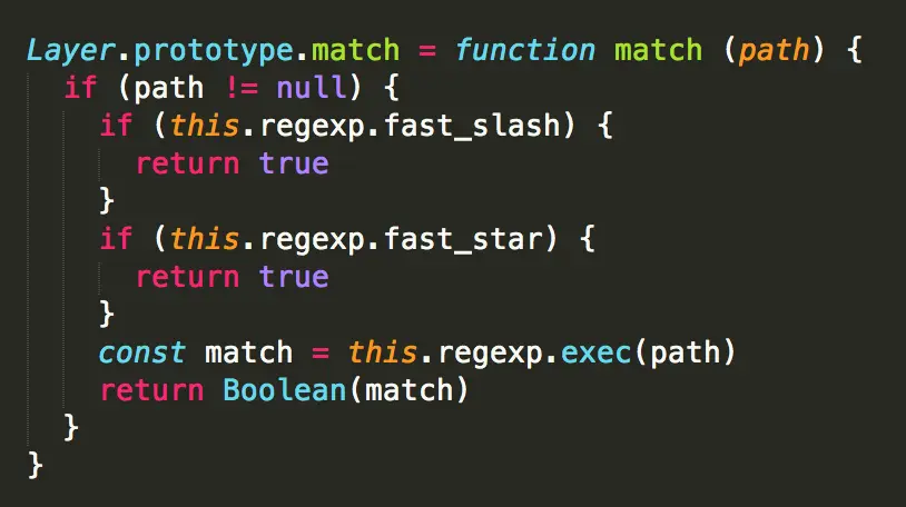 最后两句是关键,调用正则表达式匹配目标path是否和layer的path相符合,并返回布尔值 到这里,我们就清晰了,path是在layer的match函数里匹配的。那match函数是在哪里调用的呢?继续往下看