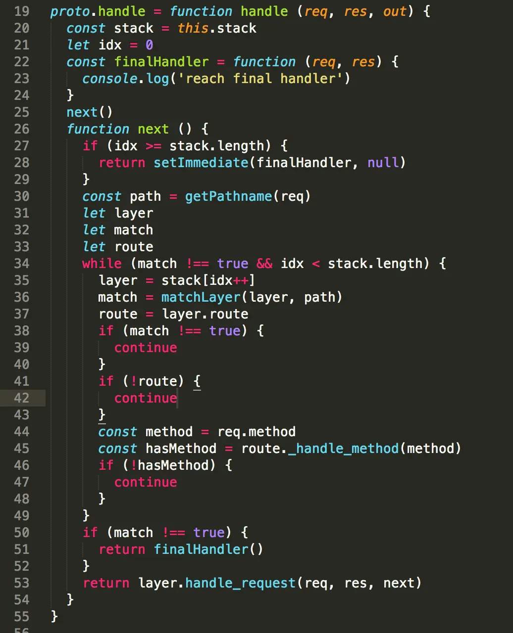 再看handle函数,当有请求时,这个函数会被调用 整体的流程是遍历stack中的layer,然后调用这个layer的handle_request,实际上是调用了layer对应的route的dispatch函数。他是通过一个next递归实现的。