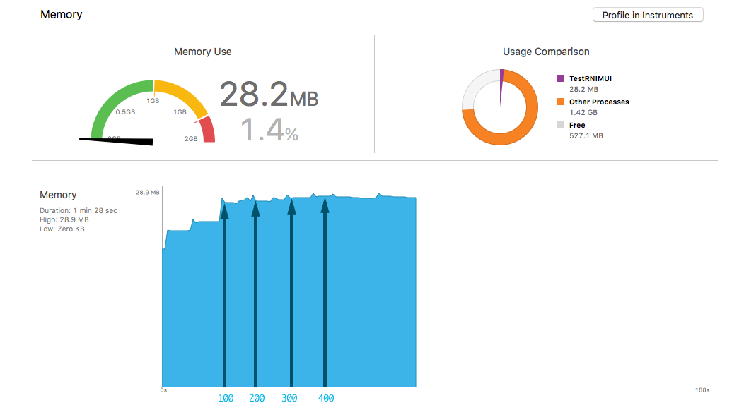 我在 iOS 平台下对两个 Demo 项目进行测试,分别测试了内存和能耗。