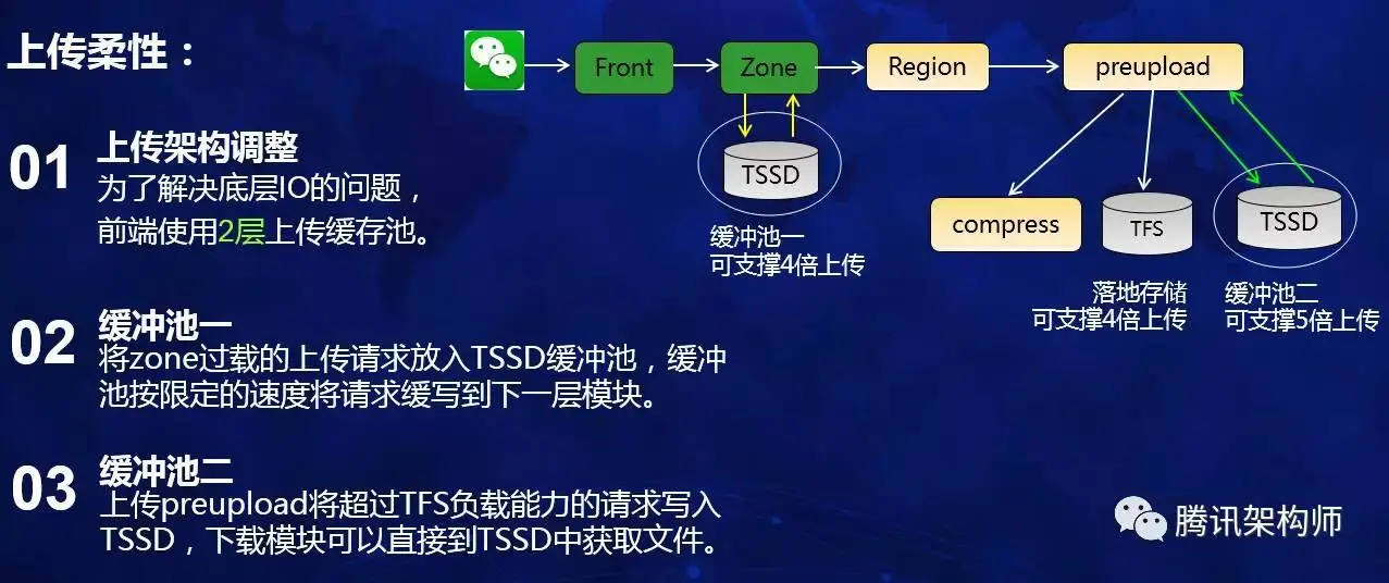 由于上传preupload接口机及后层的逻辑模块等,都无法支持10倍涨幅。所以在架构中另外搭建了两套TSSD缓冲池,缓冲池用于临时存储新上传的文件,可以支持读写。按上图所示,在zone模块处增加了缓冲池一,在上传preupload处,增加了缓冲池二。两个缓冲池的作用是有区别的: